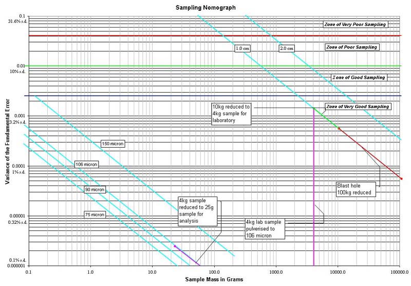 The test work establishes appropriate sampling protocols for particular ores and allows for the design of sample flow sheets from the field through to sample preparation and assaying. Errors at each stage of sample size diminution can be calculated.